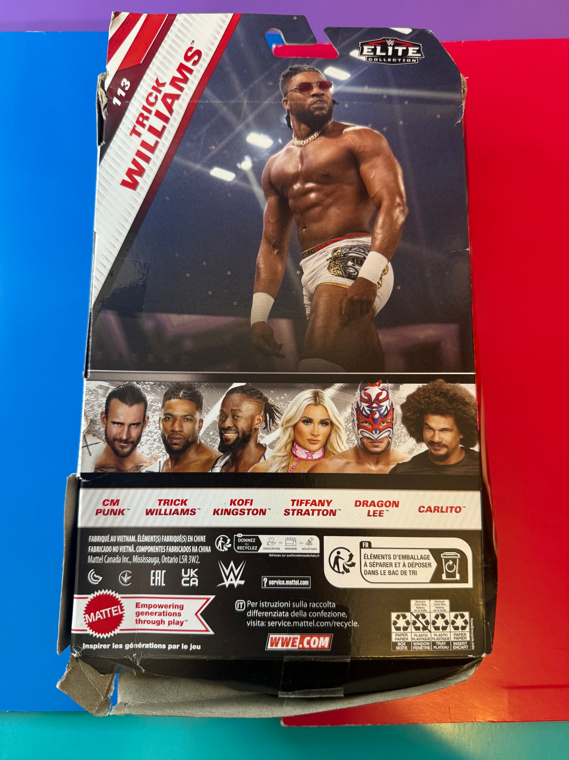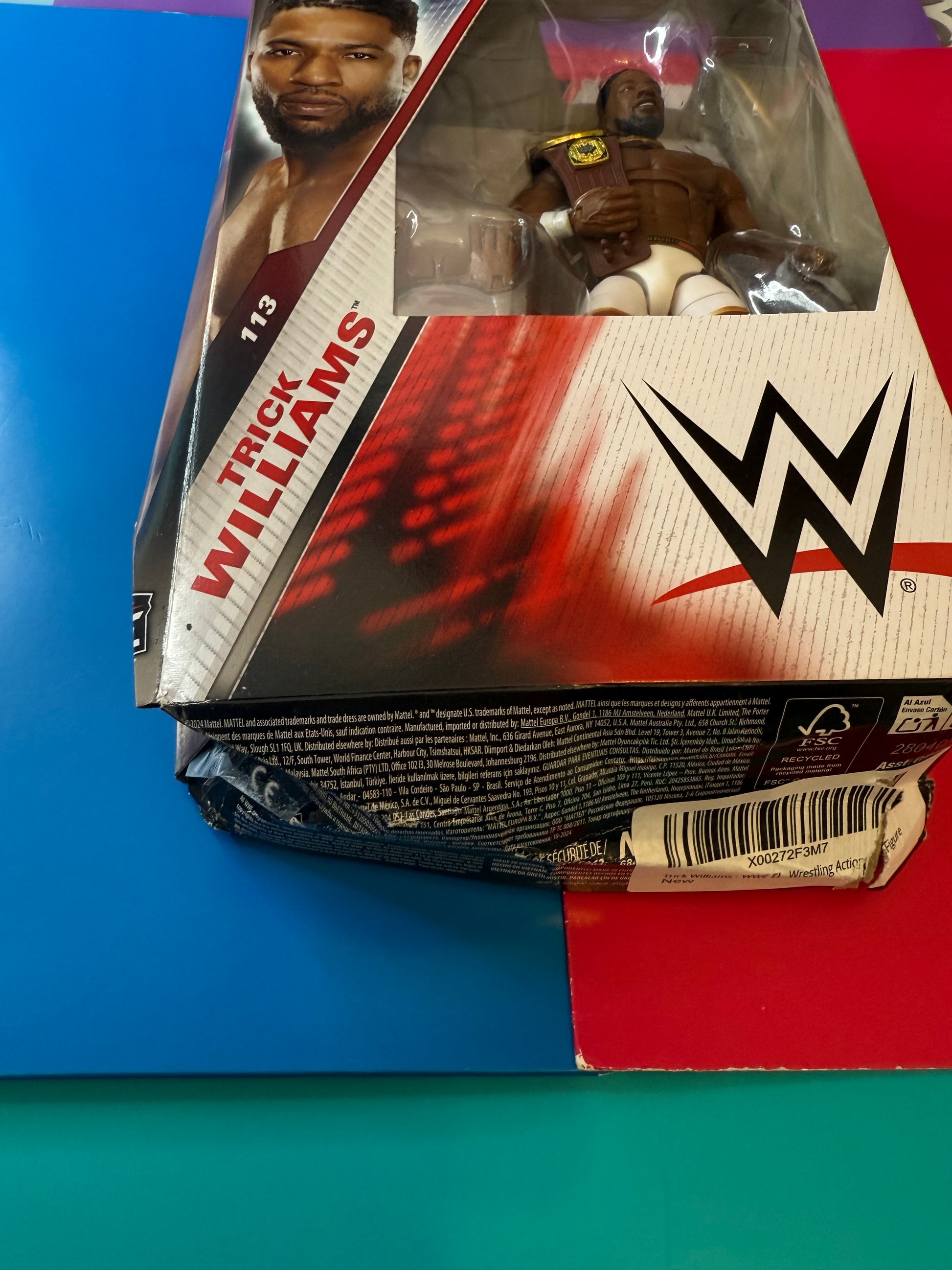 WWE Mattel Elite series Trick Williams wrestling figure, unopened and sealed in box (box has heavy damage)